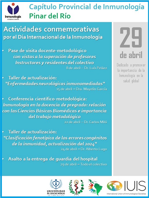 El Capítulo Pinar del Río de la Sociedad Cubana de Inmunología desarrolla su programa de actividades científicas, asistenciales y docentes en saludo al Día de la Inmunología, que anualmente se celebra cada 29 de abril.