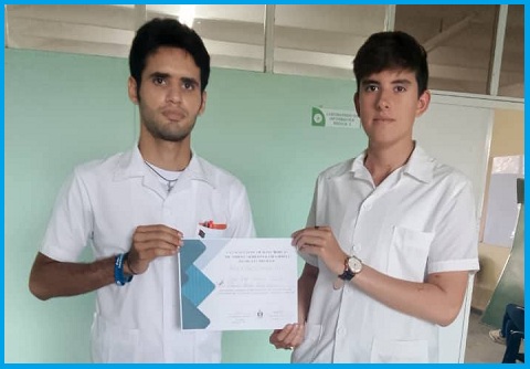 Mario Sergio (izquierda) y Manuel Ernesto obtienen su primer reconocimiento en un evento científico de las Ciencias Médicas.