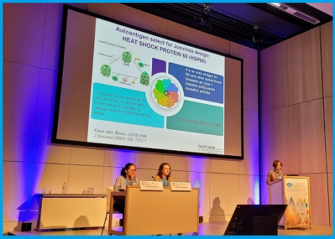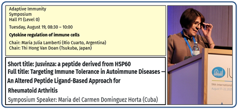 Las evidencias preclínicas y clínicas de Jusvinza, un péptido derivado de hsp60 a partir de modelaciones bioinformáticas, mostraron su actividad antinflamatoria sin efecto inmunosupresor, con potenciales aplicaciones en enfermedades autoinmunes y neurodegenerativas, además de su uso en Cuba durante la pandemia de covid-19. La Dr. C. María del Carmen Domínguez Horta, jefa del grupo que obtuvo el producto, expuso los principales resultados en el Simposio Cytokine regulation of immune cells, que sesionó entre 08:30 y 10:00, hora local.