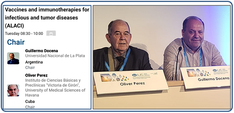 En el mismo horario, pero en el salón M de la sede, el Dr. C. Oliver Pérez presidió, junto al Profesor Guillermo Docena, de Argentina, el Simposio Vaccines and immunotherapies for infectious and tumor diseases, organizado por la Asociación Latinoamericana y del Caribe de Inmunología (ALACI). En la sesión se presentaron las siguientes ponencias: