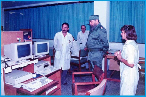 Fidel Castro junto al Dr. Agustín Lage Dávila (izquierda), Director fundador del CIM, en una de sus visitas en los primeros años tras la fundación de la institución.