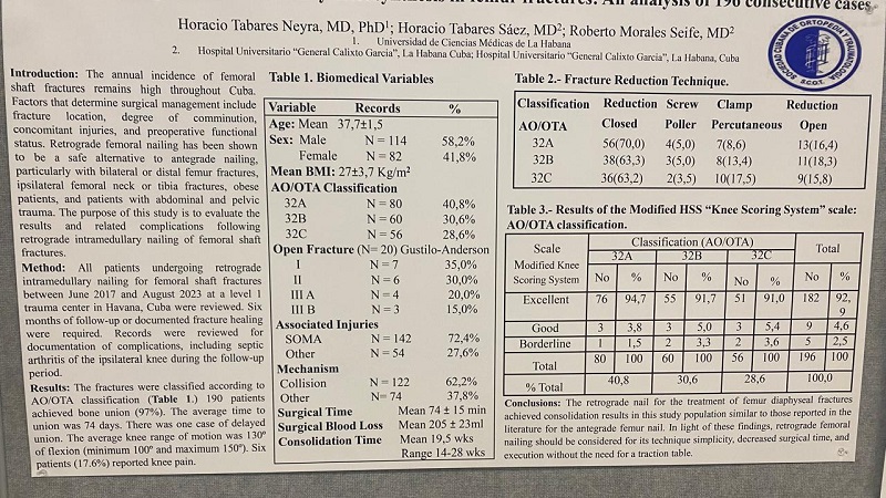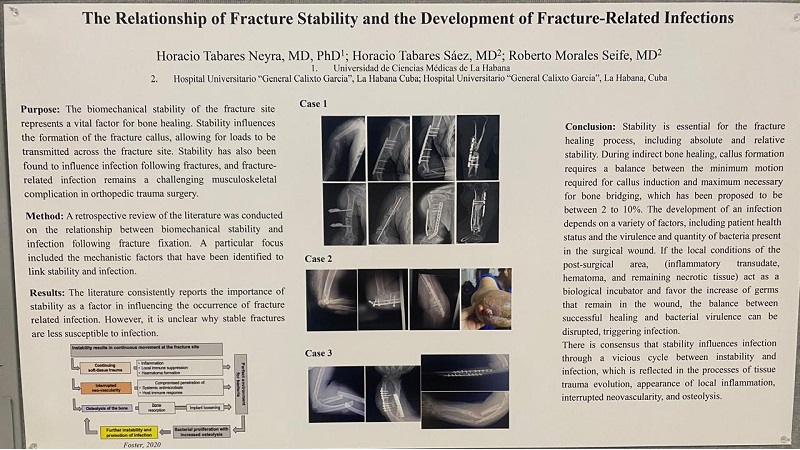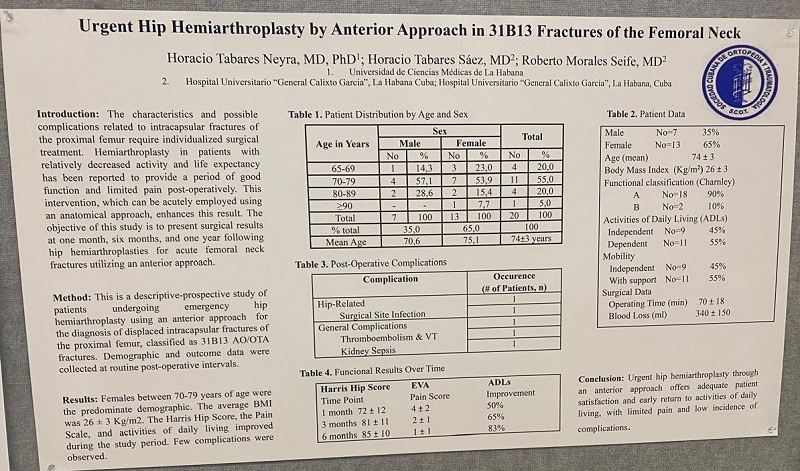 En representación de nuestro país participa el Dr. Cs. Horacio Tabares Neyra, actual presidente de la Sociedad Cubana de Ortopedia y Traumatología (SCOT), quien presentó los pósteres: “Hemiartroplastia urgente de cadera por abordaje anterior”, “Osteosintesis de fracturas de fémur por abordaje retrógrado” y “Estabilidad biomecánica e infecciones”.
